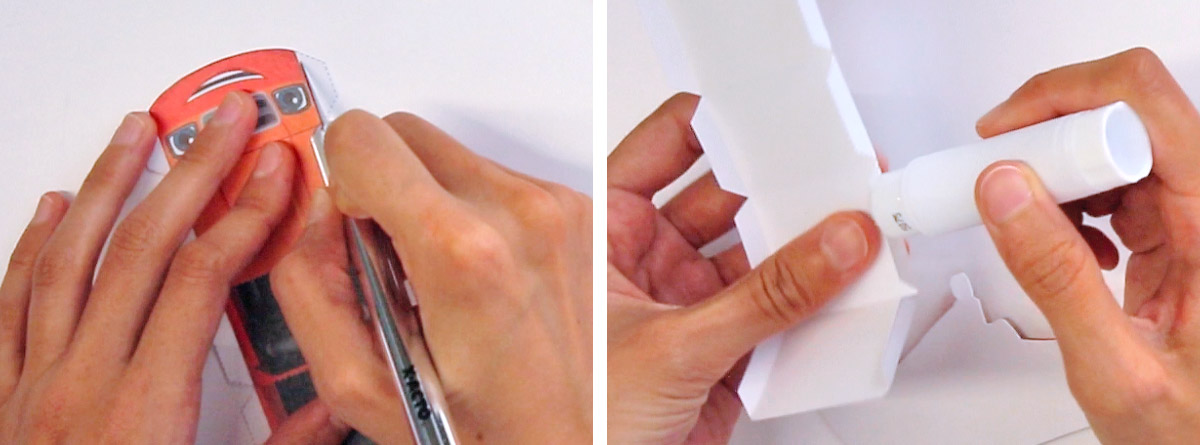 3d: For the windshield and lights, score along the middle, apply glue to the back and fold in half to join the two sides together. Set aside.